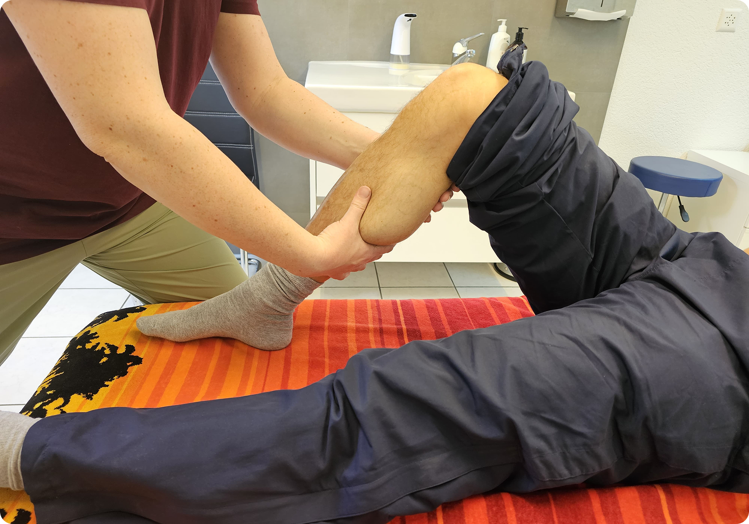 Ebenfalls begleiten Übungen zur Selbsttherapie zu Hause und zum Verhalten im Alltag meine Behandlungen, mit dem Ziel, die grösstmögliche Funktionsfähigkeit und Bewegungsfreiheit für die Patienten zu erlangen. Ein Beispiel ist das Therapeutische Dehnen, dabei wird in assistiv-passiver Form eine Dehnung der entsprechenden Muskulatur durch den Therapeuten am Patienten durchgeführt und anschliessend eine Variante gewählt, die der Patient ohne viel Aufwand auch Zuhause fortführen kann. Beim Dehnen ist entscheidend, dass die zu dehnende Muskulatur möglichst entspannt bleibt.